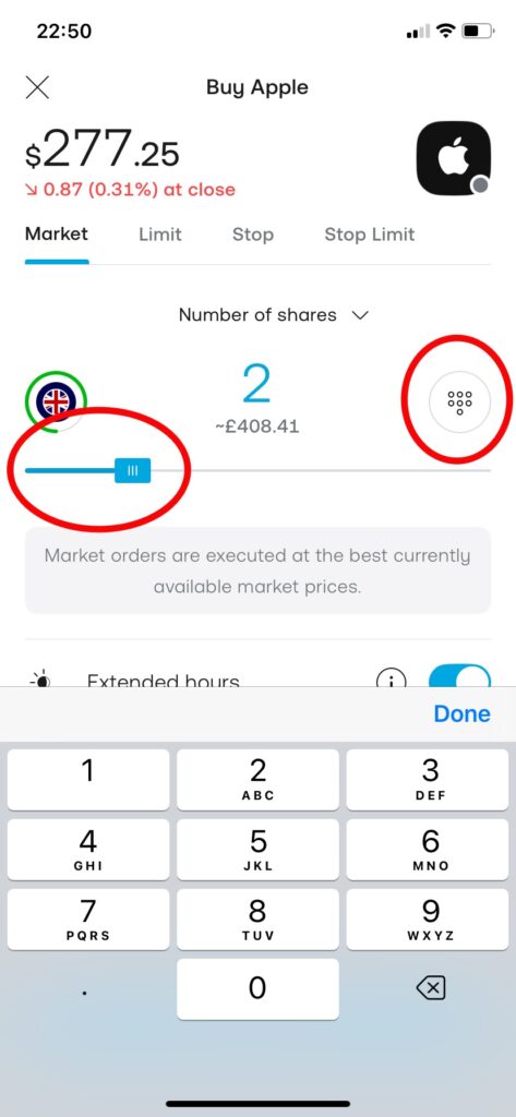 買いたい金額や株数は右のアイコンをタップで数字入力、もしくは青い棒線を移動して希望の数字を入れる
